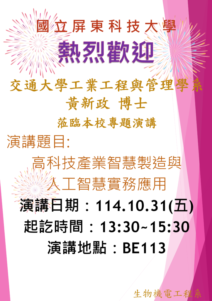 交通大學工業工程與管理學系 黃新政博士 應邀蒞臨國立屏東科技大學生物機電工程系舉辦專題演講