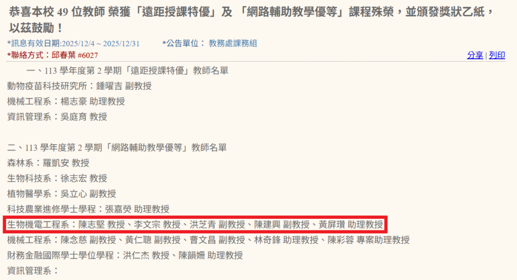 恭喜屏科大生物機電工程系 5 位教師 榮獲 「網路輔助教學優等」課程殊榮 陳志堅 教授、李文宗 教授、洪芝青 副教授、陳建興 副教授、黃屏瓚 助理教授