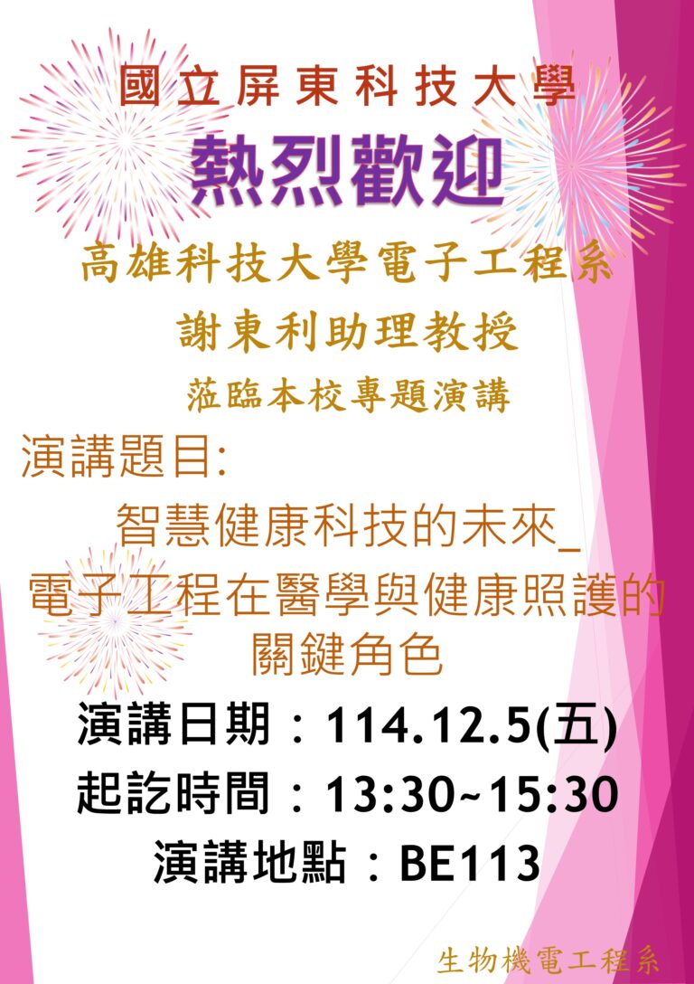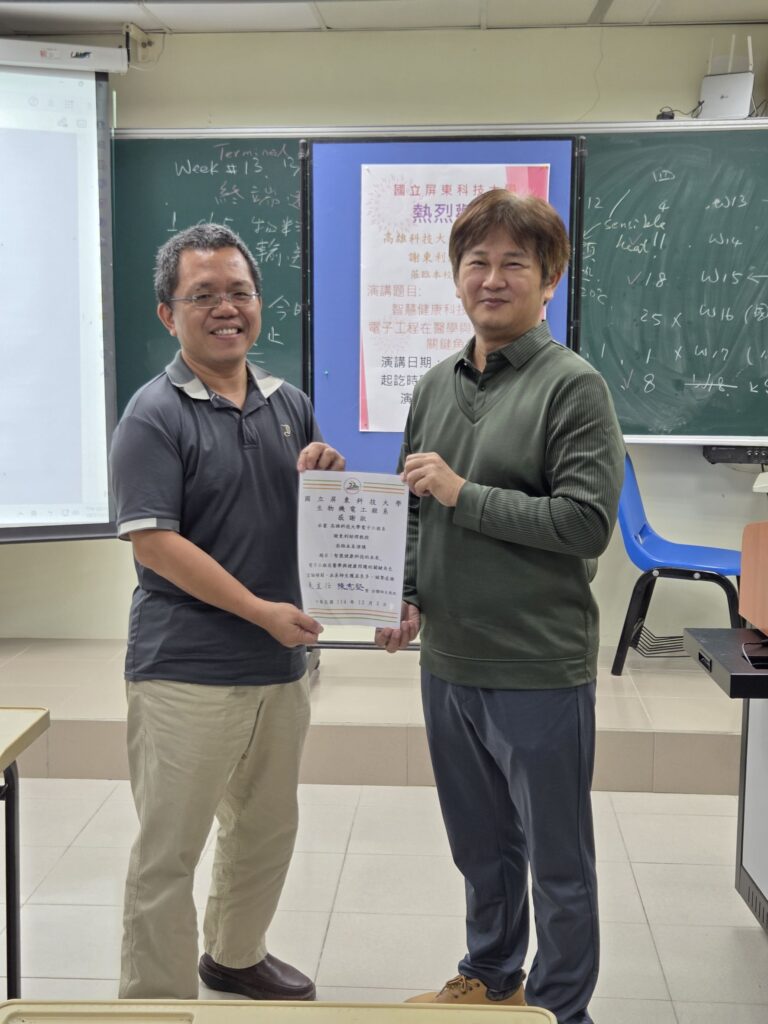 高雄科技大學電子工程系 謝東利助理教授 應邀蒞臨國立屏東科技大學生物機電工程系舉辦專題演講