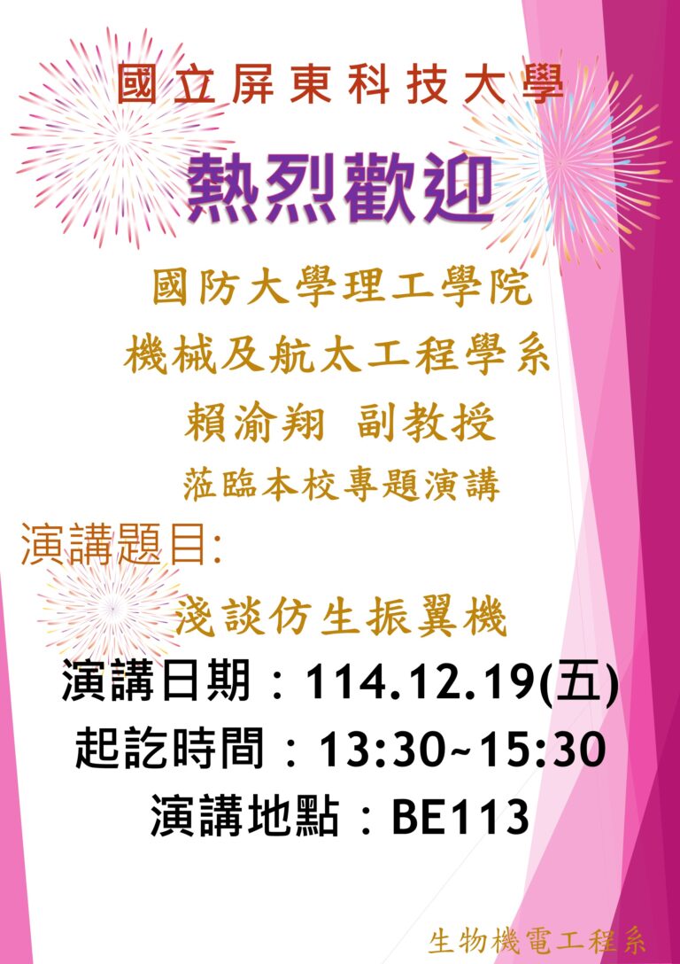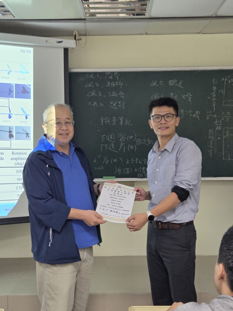 國防大學理工學院 機械及航太工程學系 賴渝翔 副教授 應邀蒞臨國立屏東科技大學生物機電工程系舉辦專題演講