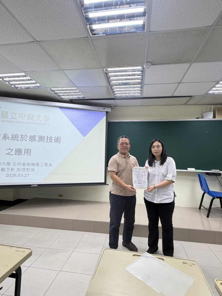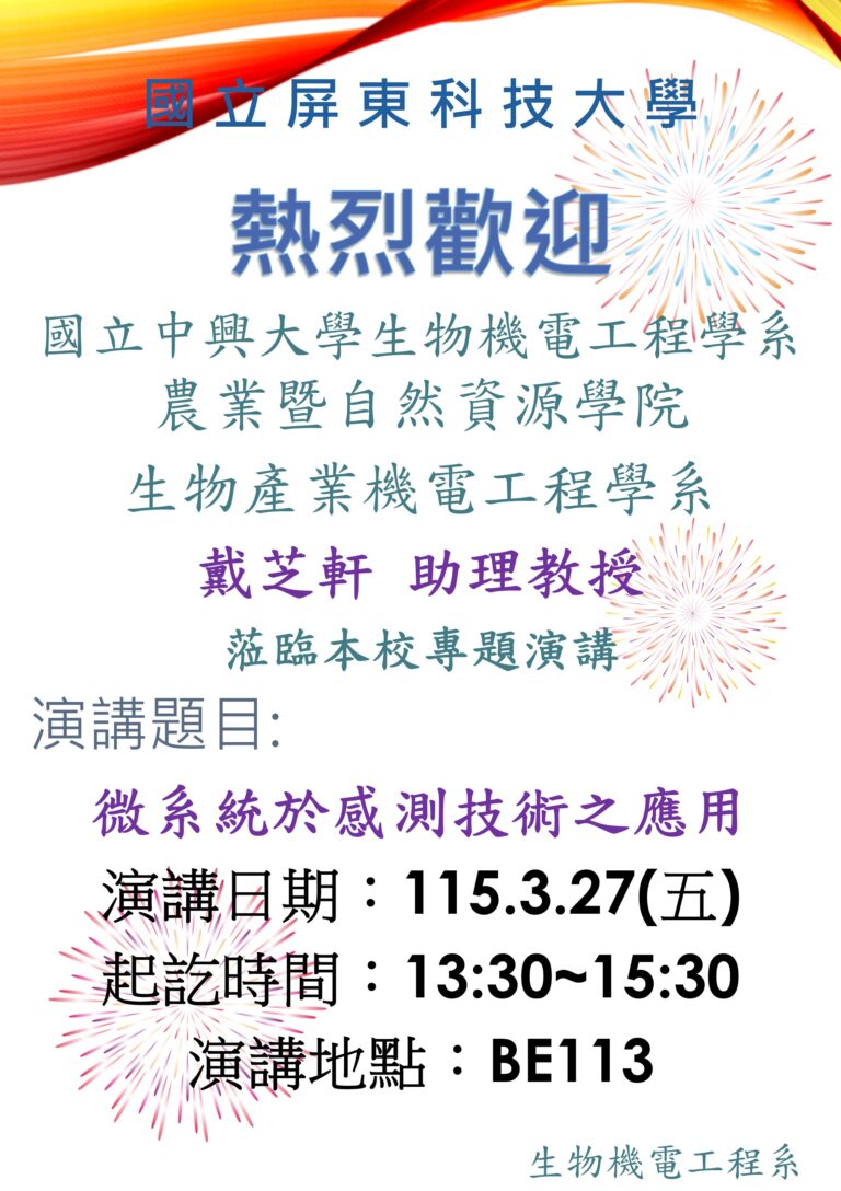 國立中興大學生物機電工程學系 農業暨自然資源學院 生物產業機電工程學系 戴芝軒 助理教授 應邀蒞臨國立屏東科技大學生物機電工程系舉辦專題演講